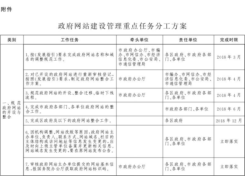 各区政府、市政府各部门、各单位要对本地区、本部门、本单位及本系统的政务服务网、公共资源交易网、数据开放网等各类网站进行全面梳理,摸清底数。2018年6月底前完成市政府各部门、各单位政府网站的规范整合工作,2018年12月底前完成区级及以下政府网站的规范整合工作。